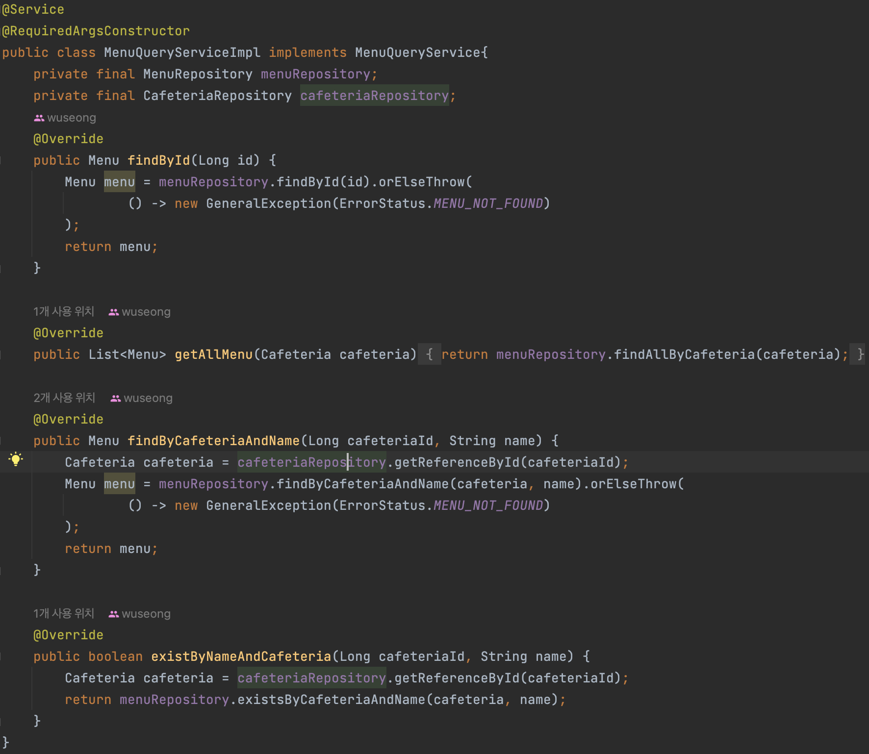 그런데 이렇게 cafeteria를 직접 받는 것으로 바꾸다 보니 이미 식당에 존재하는 메뉴인지를 확인하는 MenuQueryService의 메서드에서 조건문으로 사용했던 cafeteriaId를 직접 cafeteria로 받아야 했다.